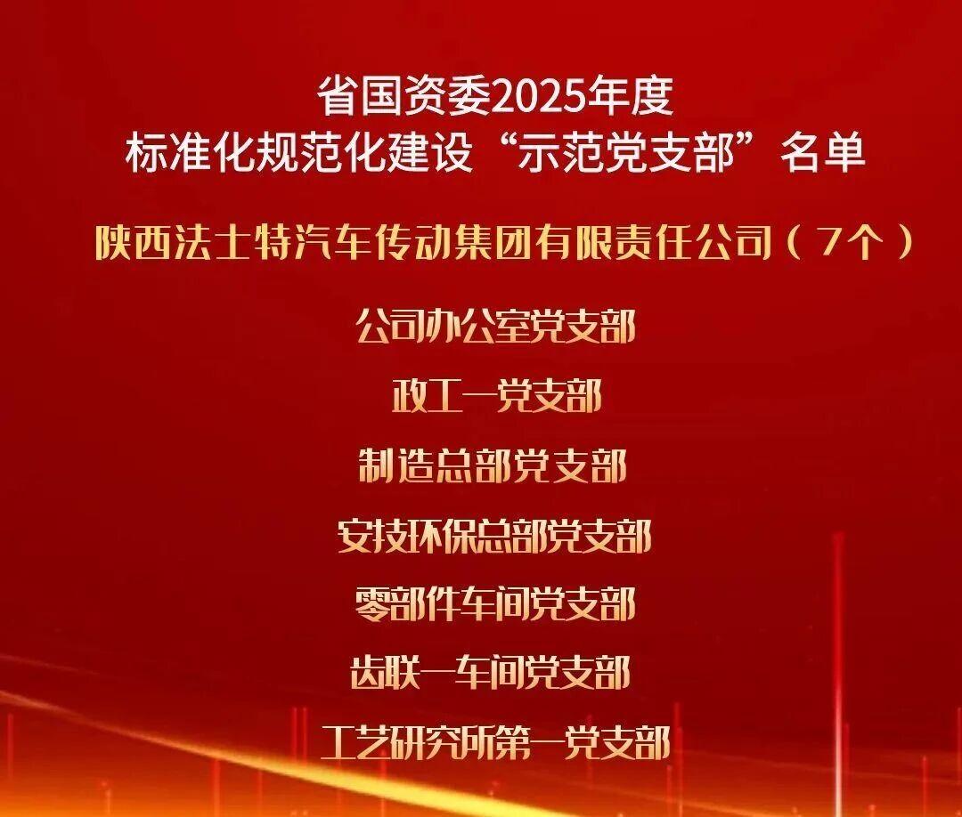 點擊量:521近日,陜西省國資委黨委通報2025年度標準化規范化建設示范黨支部名單,法士特集團公司辦公室、政工一、制造總部等7個基層黨支部榜上有名,榮獲省國資委“示范黨支部”稱號。這既是對法士特集團黨委深耕黨建品牌建設、推進基層黨組織標準化規范化建設成果的高度肯定,更彰顯了企業以制度落實強化組織效能、推進黨建與業務深度...